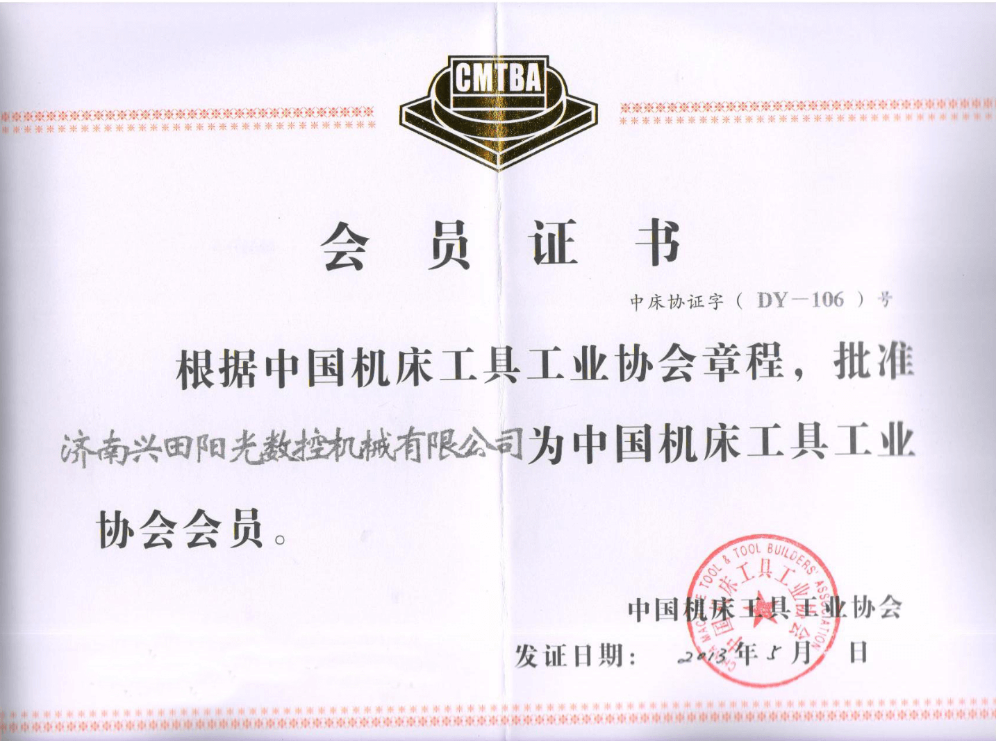 中國機床工具工業協會會員證書
